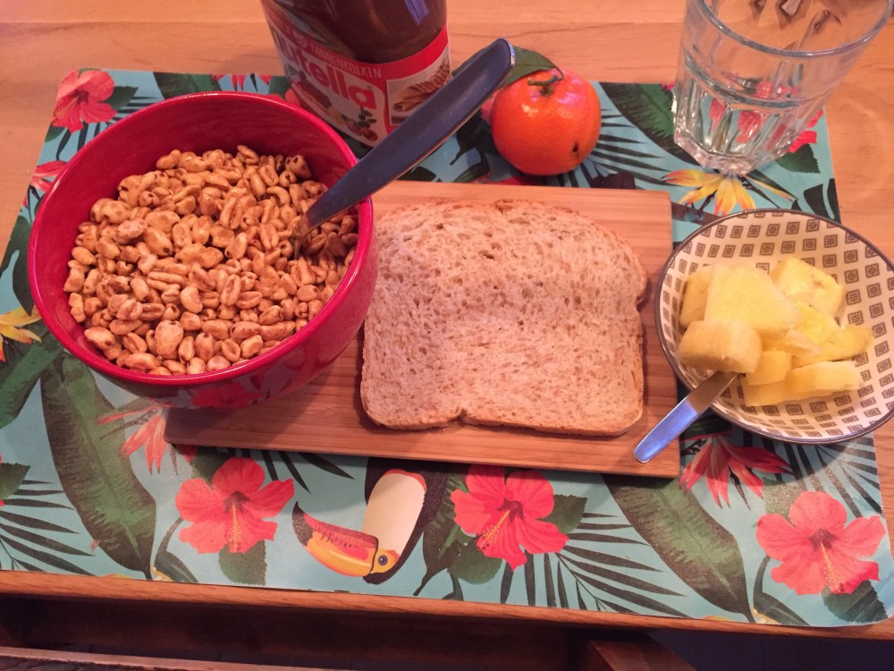 Tis morning I ate bread as usual and a jar of cornflakes it was a good meal to start the day. I also ate some pineapple.
