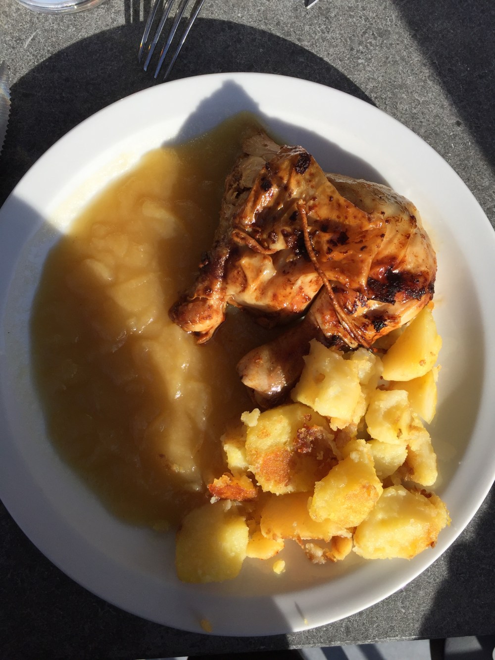 For lunch I ate chicken with applesause and potatoes. it was super tasty.